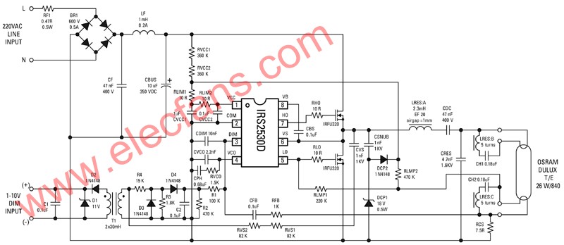 图4展示了典型的电路图。图中的AC输出电压在被DC母线电容器滤波前,已经通过全波整流和EMI滤波器。有了IR的HVIC程序,IRS2530D能够直接驱动由MHS和MLS组成的半桥,控制预热、激发和电灯调光电压。这个原理图也显示RVCC1及RVCC2电阻提供IC的起动电流,不过每当半桥开始振动,它的工作便会由CSNUB、DCP1和DCP2所组成电荷泵取代。按前文的建议,电源滤波器是由CVCC1、CVCC2、RLIM1及RLIM2提供。另一方面,谐振电路 (LRES和CRES) 带来电灯触发所需的高电压。这个电路也提供电灯调光所需的低通滤波。至于隔直电容器,也就是CDC,就负责防止电灯因水银迁移而造成电灯未端变黑,或者缩短灯管寿命。