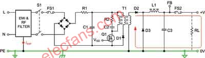 本地电路直流接地与电源接地参考电压间的链路通常由负责将线路电压转换成所需直流输出的电源提供。图1显示了一款低成本开关模式电源的简化结构图,该开关模式电源通常用于个人电脑、激光打印机和其他设备。SMPS 输出的直流接地通过SMPS Chassis以电源的保护性接地(PE)导线为参考。因此,该直接链路起了一个感应导线的作用,从而将PE电压变成了本地直流接地电压。