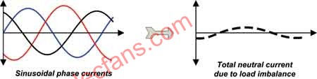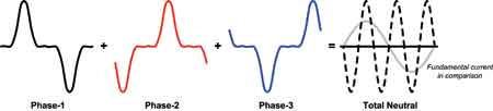 所有中性导线都并入配电板中的一个大直径中性导线,就像一个变压器一样(见图5)。在线性负载情况下,多相位系统的中性电流在一定程度上相互抵消。由于负载不平衡(见图3),只有总中性电流的一小部分保留了下来。