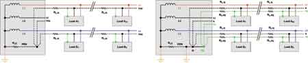 TN-C-S 系统通过开启配电板中一个额外的 PE 导线来降低 GPD。此外,系统的中性和PE导线的星形连接有一个二次接地,从而降低了该点处的等电位并抵消了源线路阻抗RLS两端 PEN 处的额外大压降。