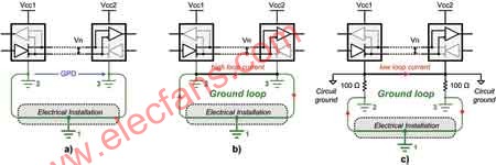 就仅限于一个本地电源供电的电路而言,GPD不会导致什么问题。在设计两个远程电路间的通信链路时(即现场总线-收发器站),GPD就变得引人关注了,这两个远程电路间的通信链路由不同的电源供电。