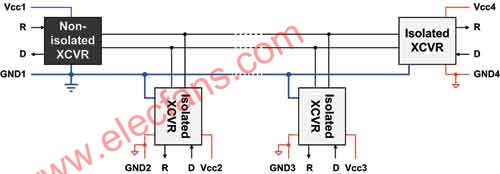 图8显示了两个远程收发器节点的详细连接,而图9则显示了一个使用了多个收发器的隔离式数据传输系统的例子。除1个收发器以外,所有其他的收发器均通过隔离连接至总线。左侧的非隔离收发器为整个总线提供了单接地参考。