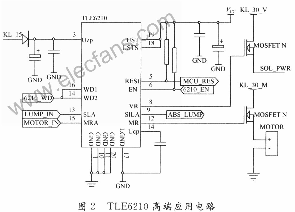 电磁阀高边总开关的输出引脚为VR,当ABS系统上电复位或看门狗给出控制信号,输出脚即切换到ON状态,这样符合ABS实际工作的逻辑,也保证了当ABS系统发生故障时,可迅速地退出对电磁阀的控制,恢复到常规制动。芯片的MRA脚为控制信号输入端,输出引脚MR驱动直流电机。当MCU的I/O口给MRA脚一高电平时,外接的MOSFET导通,直流电机实现回油功能。由于电磁阀和电机为感性负载,还需要外接反向续流二极管。芯片的驱动部分具有过温保护,过流保护和短路保护,当出现上述故障情况时,能自动关闭芯片,故有很强的自保护特性。