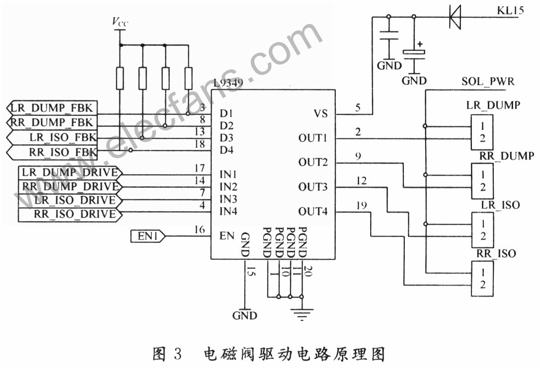当前在ABS设计中普遍采用的电磁阀驱动电路设计均以功率MOSFET为主,辅之以保护回路,隔离措施等以保证其可靠性,还要设计专门的自诊断回路以进行故障检测。虽然在具体电路的设计上分立方案有一定的灵活性,但成本和PCB空间的耗费较高;本方案采用ABS专用集成芯片TLE621O和L9349,集驱动和监测功能于一身,应用于ABS系统中能降低功耗,便于故障检测,提高可靠性,大大改善了整个系统的性能。