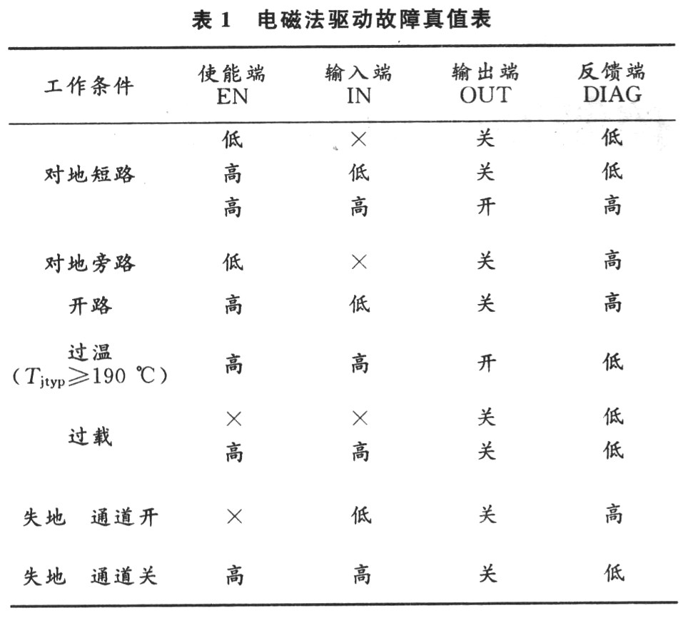 D1~D4是故障诊断引脚,必须外接上拉电阻才能使用,电路正常工作时,该引脚为逻辑高电平,若有故障发生,即会自动置为逻辑低电平。通过对各独立通道的输入控制端和状态反馈端进行逻辑组合,可实时识别出输出端的工作状态,并立即做出相应的措施,包括退出ABS功能,点亮故障显示灯,传输故障码。功能真值表见表1。