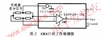 AM417是德国Analog Microelectronics公司开发的一个用于处理可变电桥信号的低成本比例电压转换接口集成电路,该电路的输出信号可以成比例地自动跟踪电源电压的变化,这点对于共用一组电源的控制系统来说非常有用。因此,这种电路对于处理来自诸如硅压力传感器的差分输出信号十分理想。AM417是由一个用于换能器的比例输出电流源、一个用于处理差分输入信号的高精度前置放大器和一个电压输出级组成的。其增益、偏置和输出电压范围(最大为0.4~0.5V)可以通过外接电阻来调整。它的电压输出级为开路集电极输出,输出的电流可达10mA。用一个外接电阻就可以最大限度地对输出电流进行有效的控制。