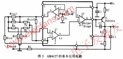 AM417电压输出主要通过一个外接的开路集电极三极管T1(由电压输出级驱动)来完成,其输出级电流可达11mA。而增益GOUT可以通过外接电阻R3和R4在2~11之间进行调整。公式如下:
