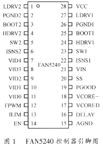 FAN5240控制器共有28个引脚,如图l所示。具有QSOP28和TSSP28两种封装形式,FAN5240的引脚功能如下。