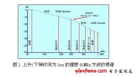 大部分数字IC生产商都至少能生产某一系列辐射较低的器件,同时也能生产几种抗ESD的I/O芯片,有些厂商供应EMC性能良好的VLSI(有些EMC微处理器比普通产品的辐射低40dB);大多数数字电路采用方波信号同步,这将产生高次谐波分量,如图1示。时钟速率越高,边沿越陡,频率和谐波的发射能力也越高。 因此,在满足产品技术指标的前提下,尽量选择低速时钟。在HC能用时绝不要使用AC,CMOS4000能行就不要用HC。要选择集成度高并有EMC特性的集成电路,比如: