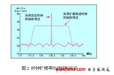 所谓的“扩展频谱时钟”是一项能够减小辐射测量值的新技术,但这并非真正减小了瞬时发射功率,因此,对一些快速反应设备仍可能产生同样的干扰。这种技术对时钟频率进行1% ~ 2% 的调制,从而扩散谐波分量,这样在CISPR16或FCC发射测试中的峰值较低。所测的发射减小量取决于带宽和测试接收机的积分时间常数,因此这有一点投机之嫌,但该项技术已被FCC所接受,并在美国和欧洲广泛应用。调制度要控制在音频范围内,这样才不会使时钟信号失真,图2是一时钟谐波发射改善的例子。扩展频谱时钟不能应用于要求严格的时间通信网络中,比如以太网、光纤、FDD、ATM、SONET和ADSL。