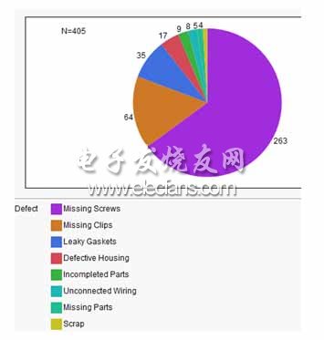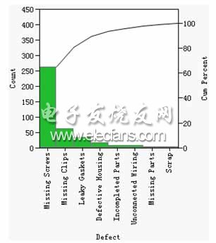 图一显示的就是一家生产电子产品的公司在对近期生产中发生的缺陷记录进行统计,并整理成的排列图形式。显而易见,“Missing Screws”出现的频次显著地高于“Missing Clips”、“Leaky Gaskets”等其他缺陷,应该抓住这个机会,将它作为质量改进的主要方向,值得对它作深入的调查研究与分析。