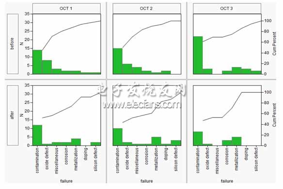 JMP软件深知实际工作中这些细节的重要性,因此在其“Pareto图”平台上都提供了相应的选项。例如,如果我们在记录缺陷时记录了日期(OCT1、OCT2或OCT3)和设备清洗状态(before或after),就可以将一张反映整体的排列图细化为6(=3*2)张乃至更多、体现两个维度类别信息的分层排列图(如图二)。这样就可以更加清晰地观察不同日期、不同设备清洗状态下的缺陷分布情况,便于我们发现关键问题,同时也可用于进行不同条件下的产品质量对比。