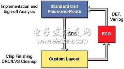图说:在传统设计环境中,自订布局以及标准单元布局与绕线之间的循环可能会增加好几个星期的芯片开发时间。
