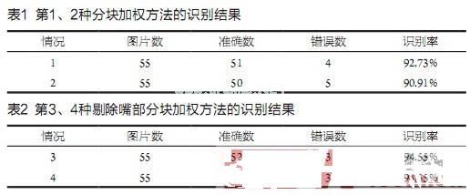 利用在Yale人脸库中的人脸图像,分以下4种分块加权的情况进行实验(识别结果见表1和表2)。