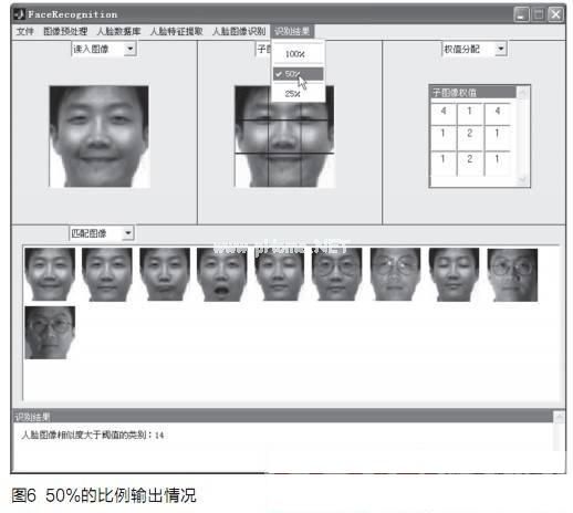利用贝叶斯分类器估计测试样本与训练样本之间的人脸图像相似度,满足阈值初始化设定值的人脸图像和相关类别情况的文字说明显示于相应界面内。满足阈值要求的人脸图像可以按照50%的比例输出,也可以按照其他的比例输出。