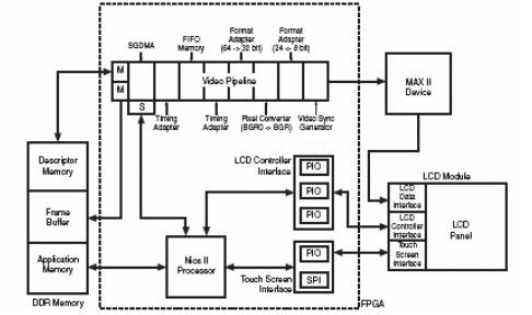 图4 所示为实现NEEK LCD 控制器设计外设和接口的高级结构图。Cyclone III FPGA 的视频流水线、LCD触摸屏模块以及MAX® II CPLD 是NEEK LCD 控制器的主要组成。