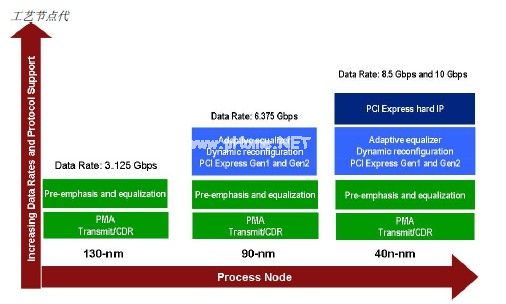 FPGA 经历了几个工艺代的发展,满足了40/100G 的需求,如图1 所示。在130-nm 工艺节点,FPGA 仅支持3.125 Gbps,而现在的40-nm 工艺节点能够支持10 Gbps 以上的数据速率。