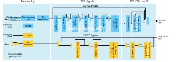 Altera® Stratix® IV GX FPGA有32个嵌入式收发器,支持600 Mbps到8.5 Gbps的数据速率,另外16个收发器支持600 Mbps 到6.5 Gbps 的数据速率( 总共48 个速率达到6.5 Gbps 的收发器)。收发器包括物理编码子层(PCS) 和物理介质附加子层(PMA),这两个子层使Stratix IV FPGA 能够实现标准和专用协议。图2 所示为Stratix IV GX 收发器模块结构图。