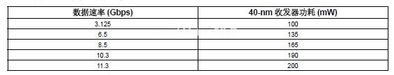 数据速率(Gbps) 40-nm 收发器功耗(mW)