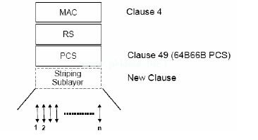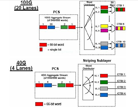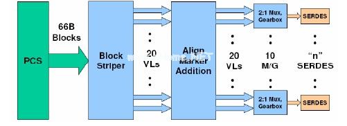 位加扰后的数据通过简单的罗宾带机制,分布到20 个虚拟通路(VL) 上。同时,周期性地在每个VL 上加上特殊的标记(66B 字)。接收PCS 模块使用这些标记来找到VL 中的数据,去掉偏移,重新排序,恢复100G汇集数据流。这20个VL终复用到10通路PMA,每个独立的PMA通路运行在10.3125 Gbps。数据通过10个100G-10 位接口(CTBI) 通路解复用。每个VL 中的对齐标记可以实现带内偏移机制。