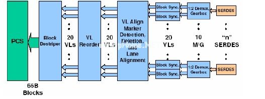 图8 显示了 100G PCS 模块的接收通路。接收通道将数据从10 个( 其中, n=10) 通路解复用至20 个VL。