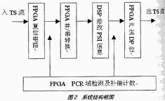 而在该系统的设计中,并没有采用这种方法,而是利用了I/O FIFO的9比特特性,FPGA直接搜索9位包同步字节0X147。另外,在PCR域补偿计数的模块中,也存在一个PCR域确认的问题。PCR域的长度为6个字节48位码字(42位有效码字加6位保留位),在FPGA已经装载PCR域的初值后,完全可以将PCR域中的6个字节改为预先设定好的协议码字(当然,它们必须对于码流而言是唯一的)。这样,在TS码流输出端进行将补偿计数后的PCR数值重新装载进PCR域的工作时,FPGA不仅能够很方便的识别出PCR域的具体位置,而且还可以从这些协议码字中读出较多的复用信息。