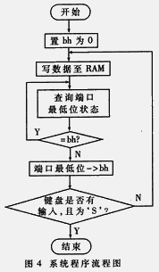 系统程序主要完成以下功能:由微机将符合一定建议数据格式的数据写入RAM中,查询端口的状态并完成相应的操作,结束系统的工作等。系统程序流程图如图4所示。