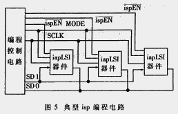 ispLSI器件的编程是由片内状态机控制的,状态的输入即为进入片内的五个编程接口信号。图5给出了在系统编程电路的典型结构。