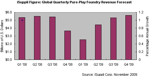 下图所示为iSuppli公司对全球各季度半导体纯晶圆代工收入的预测。