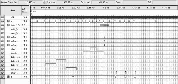 图5中clk是时钟信号;a是PC发来的16进制的控制字,也就是图4中的并行输出dataout; ma1cnt、ma2cnt、ma3cnt是三个寄存器;clrr是系统清零信号;ddsclr是DDS配置信号;fifo_clk,fifo_rd,fifo_wr,ram_rst是FIFO的时钟、读、写、清零信号;start_xmit是发送开始标志位;b是准备发送的数据。当接收a为1时,fifo_wr置1;当a为18时,把ma1cnt的值送到b。其他的操作类似,主要是端口的置位,FIFO读写状态的控制。