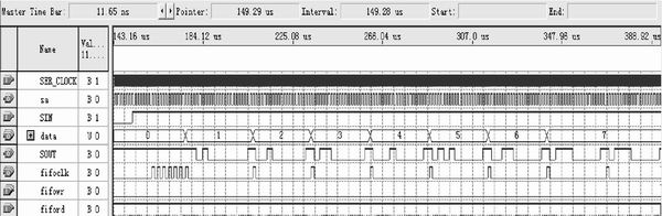 图6中SER_CLOCK是系统时钟3.6864MHz,sa是分频后的频率57600bit/s;SIN是串行输入;data是准备输出的数据;SOUT是串行输出;fifoclk、fifowr、fiford是FIFO的读时钟、写、读使能。读过程:读使能有效,先产生6个读时钟,但是不往SOUT发送数据,因为FIFO的前6个周期不是有效数据。然后产生一个读时钟,将FIFO的数据送到data,按照通信协议通过SOUT发送出去,发送结束再产生一个读时钟,读取FIFO的数据,进行下一次串行输出。
