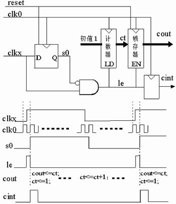 本文设计的同步测周期计数器如图1所示。图中计数器的计数时钟为clk0, 频率为f0;被测信号为clkx,频率为fx。采用一个D触发器对输入的被测信号clkx进行同步,同步输出为s0。在clk0的上升沿到来之前,如果clkx出现了上升跳变,则le信号变为高电平,计数器ct的重载信号和锁存器cout的使能信号有效。当clk0的上升沿到来时,计数器的计数值锁存,同时计数器重载为1,重新开始计数,le变为低电平。计数器在其他时间里进行加1计数,锁存器的值则保持不变。该测周期计数器能在clkx的每个上升沿之后输出计数值,实现了对被测信号进行测周期计数,并始终输出其最新一个周期的计数值,图中cint端输出一个clk0周期宽度的高脉冲,用于指示新的计数值锁存。