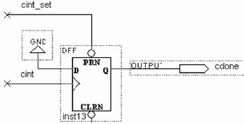 测周期计数值M、C分别由mout和cout端口输出,通过一定的接口由微处理器或其他的数据处理模块获取,进行频率的计算和显示,根据实际的应用情况设计输出接口,这里不再详述。当频率计新一轮的测周期计数完成后,计数器通过cint和mint信号指示处理单元来获取数据,其高电平脉冲的宽度为一个计数时钟周期。当计数时钟频率很高时,一些慢速的单片机可能无法捕获,因此(以cint信号为例)增加如图3所示的电路。cint上升沿使D触发器输出引脚cdone置0,通知单片机取数,单片机读结果时,相应的地址信号和读信号有效使图中的cint_set有效,cdone被复位为1,等待下一次cint脉冲的出现。通过该电路,慢速单片机就可以捕获频率计计数完成的指示信号。
