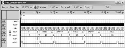 上述数字频率计的VHDL设计在Altera公司的Quartus II开发平台下进行了编译和仿真,图4是在clk0输入10 MHz方波,clkx输入周期为156ms(频率为6.41KHz)方波,分频系数C0取15000时的仿真波形。