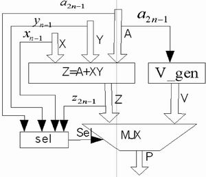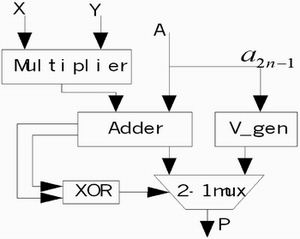 =>的饱和运算,在一般情况下,计算P时,可以将X 、Y经乘法器相乘,然后将积与A相加,如果发生溢出,则将所得的和修正为饱和值。这实际上就是将乘法器与加法器简单串联,然后进行饱和值修正,如图1所示。但是以这种结构实现的MAC单元,由于乘法器中的最终加法器和加法器只是简单的串联在一起,在关键路径上就有两级串联的加法器,面积、延时都比较大。