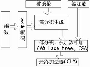 本文选用修正booth算法和Wallace tree结构实现24×24高速并行乘法器。图3是24×24高速乘加器的结构框图,主要由booth编码、部分积阵列、Wallace tree以及最终加法器构成。