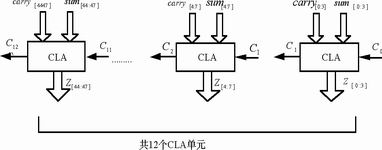 在Wallace tree阵列中,Wallace tree的每一列都产生一个初步的进位项和一个初步的加法结果,最后必须使用一个快速加法器将所有的进位项和加法结果加起来。为了获得较高性能,一般采用先行进位加法器(CLA),它可以同时产生所有的进位项,因而可以获得极高的速度,在最坏情况下的延迟正比于n。但是随着位数的增加,进位项变得越来越复杂,相应地消耗的面积越来越大,同时速度也无法得到保证。研究表明,CLA的最佳位数是4位,这时可以在速度与面积之间取得最优的折衷。在本设计中,加数共有48位,因此将它分成12块,每块4位,块与块之间通过块间进位串联,每一块的进位只影响本块中的位,不影响更高块的位。图5为最终加法器的实现。