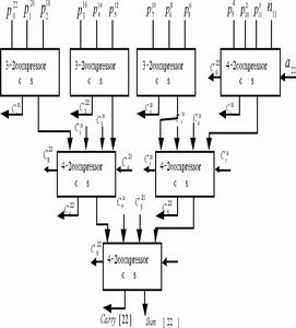 最大的树由3个3-2压缩单元和4个4-2压缩单元组成,树的高度只有3级,这比只用全加器实现时的高度要小得多,延时也小得多。对于其他较小的树,可以通过减少压缩单元的数目来实现。图4为本MAC单元中最大的Wallace tree 结构(其中a22为被加数的相应位)。