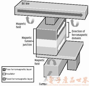 从原理上讲,MRAM的设计是非常诱人的,它通过控制铁磁体中的电子旋转方向来达到改变读取电流大小的目的,从而使其具备二进制数据存储能力。理论上来说,铁磁体是永久不会失效的,因此它的写入次数也是无限的。在MRAM发展初期所使用的磁阻元件是被称为巨磁阻(GMR)的结构,此结构由上下两层磁性材料,中间夹着一层非磁性材料的金属层所组成。由于GMR元件需较大电流成为无法突破的难点,因此无法达到高密度存储器的要求。与GMR不同的另一种结构是磁性隧道结 (MTJ),如图1所示。MTJ与GMR元件的最大差异是隔开两层磁性材料的是绝缘层而非金属层。MTJ元件是由磁场调制上下两层磁性层的磁化方向成为平行或反平行来建立两个稳定状态,在反平行状态时通过此元件的电子会受到比较大的干扰,因此反映出较高的阻值;而在平行状态时电子受到的干扰较小得到相对低的阻值。MTJ元件通过内部金属导线所产生的磁场强度来改变不同的阻值状态,并以此记录“0”与“1”的信号。