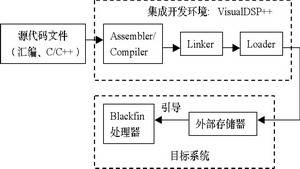 DSP应用程序编写和调试通常在ADI公司的集成开发环境VisualDSP++下完成。在软件设计阶段,可使用硬件仿真器Summit ICE通过JTAG(边界扫描测试接口)同目标处理器连接进行调试开发。VisualDSP++会将用户应用程序代码编译生成DSP可执行文件(.DXE),并通过JTAG口装入目标处理器的内存。