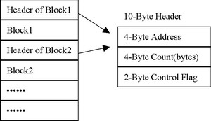 对任何一种模式,引导程序会根据模式引脚选择的外部程序存储器的类型,先读出一个10个字节的文件头(Header)。文件头由4个字节的目的地址、4个字节的传输数据数量(字节数)和2个字节的控制标志组成。如果用户程序或数据需要放在DSP内存的不同地址块,可以采用分块引导的方式来进行数据加载,每个块(Block)用不同的文件头描述。一旦所有的块装载完毕,处理器将结束引导进程,并从L1指令存储器的起始地址(0xFFA00000)开始执行放在这里的用户代码。文件头中控制标志描述了块的一些属性。图4是引导时的数据流和文件头格式。