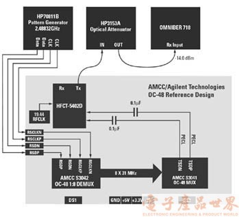 抖动容限测量。用1300nm 2x10 OC-48 SFF收发模块和参考设计板可以测量抖动容限。评估参考设计板集成了带有STS-48接口的SONET/SDH复用器/解复用器