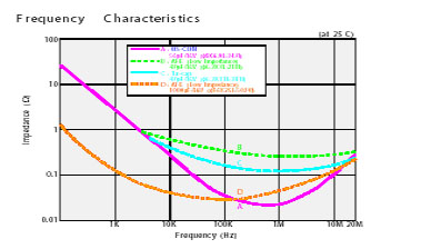 OS-CON、铝电解电容器、钽电解电容器的阻抗特性比较,OS-CON的阻抗-频率曲线近乎理想值。在100kHz处OS-CON 56μF的阻抗与高性能铝电解电容器1000μF基本上呈相同值,而且频率越高时OS-CON与铝电解电容器之间的容量比越大。