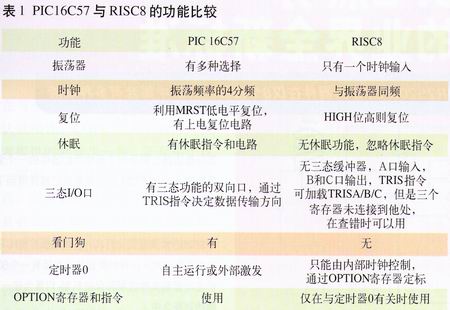 RISC8是与RISC5X很类似的免费核,与Microchip公司的PIC16C57兼容。该核在ASIC和FPGA层面上都是可综合的,并且已经被使用过。该核提供了CPU、指令译码器、寄存器、累加器、RAM等基本部件,此外还提供了基本的测试向量。在该核的程序包里还可以找到“basic”和“DDS”两个汇编程序,basic用来检测RISC8的指令,DDS则是利用该核的一个应用程序。此外还提供了关于16C57的第三方资源。但是与16C57相比,两者是有明显差别的。表1列出了两者在功能方面的比较。与其他免费核一样,该核也有明显的不足之处,如状态字STATUS中的DC位功能没有完成,以及TRIS不能影响I/O口等。