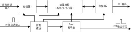 傅立叶变换实现时首先进行基2、基4分解,一般来说,如果算法使用基4实现,虽然使用的资源多了一些,但速度上的好处足以弥补。如果资源充足,使用基16、基8或基16/8复用模块,速度可以大大提高。一般FFT实现简单框图如图2所示。