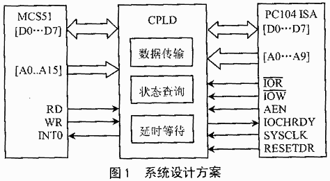 本系统用CLPD实现单片机与PC104 ISA总线接口的并行通信。由于PC104主要完成其它方面的数据采集工作,只是在空闲时才能接收单片机送来的数据,所以要求双方通信的实时性很强,但数据量不是很大。因此,在系统设计中单片机中断方式接收数据,PC104采用查询方式接收数据。系统设计方案如图1所示。