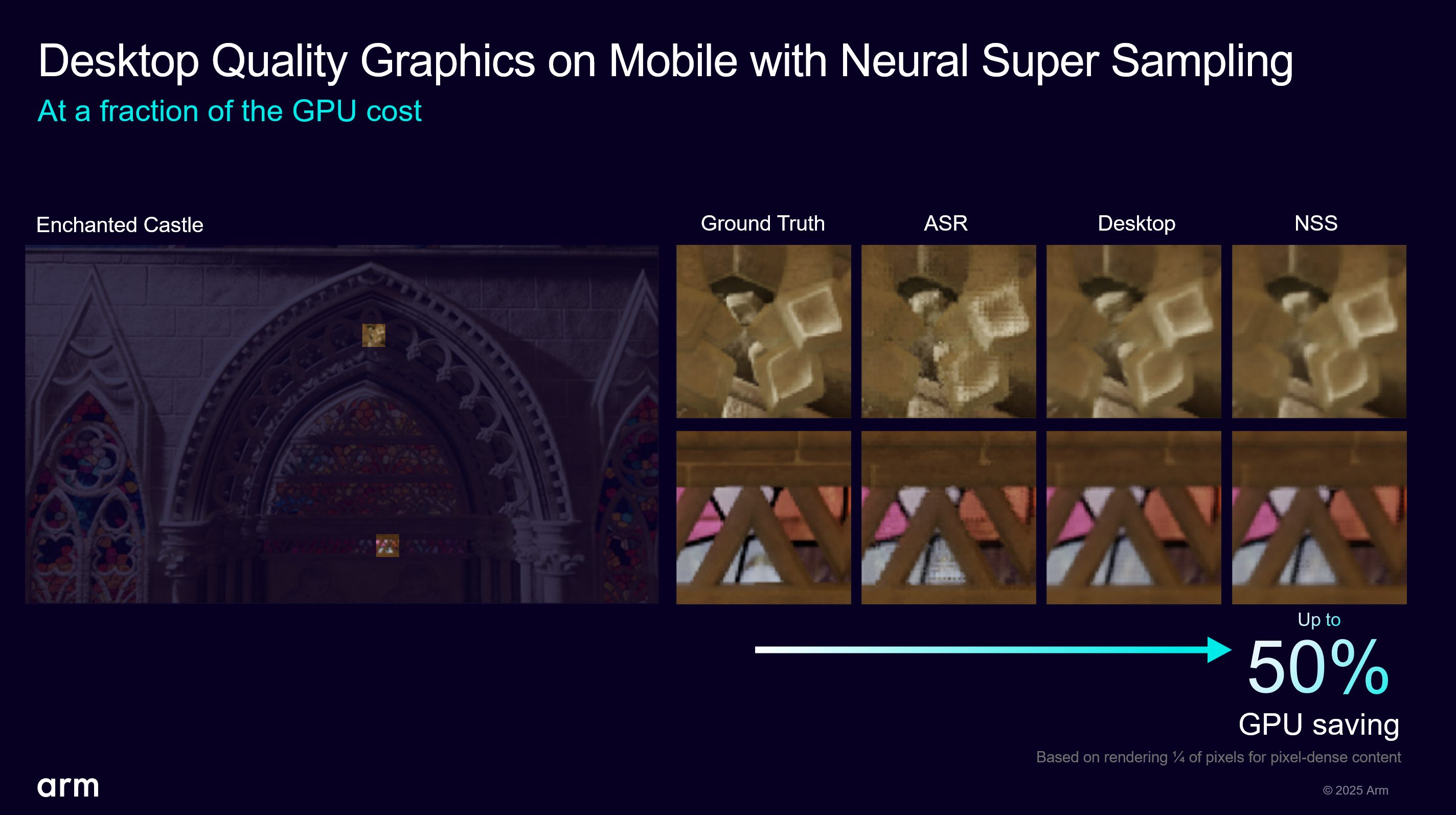 在 Arm 的 “魔法城堡” 演示中,通过使用 Arm NSS,GPU 工作负载可降低 50%,且在持续性能的设定下,当模型以 540p 分辨率渲染时,能在四毫秒内优化升级至 1080p。Steve Steele 称,Arm NSS 只是此次发布的 Arm 神经技术的首个用例,另外还有两个新用例正在开发中,不久后将与大家见面: