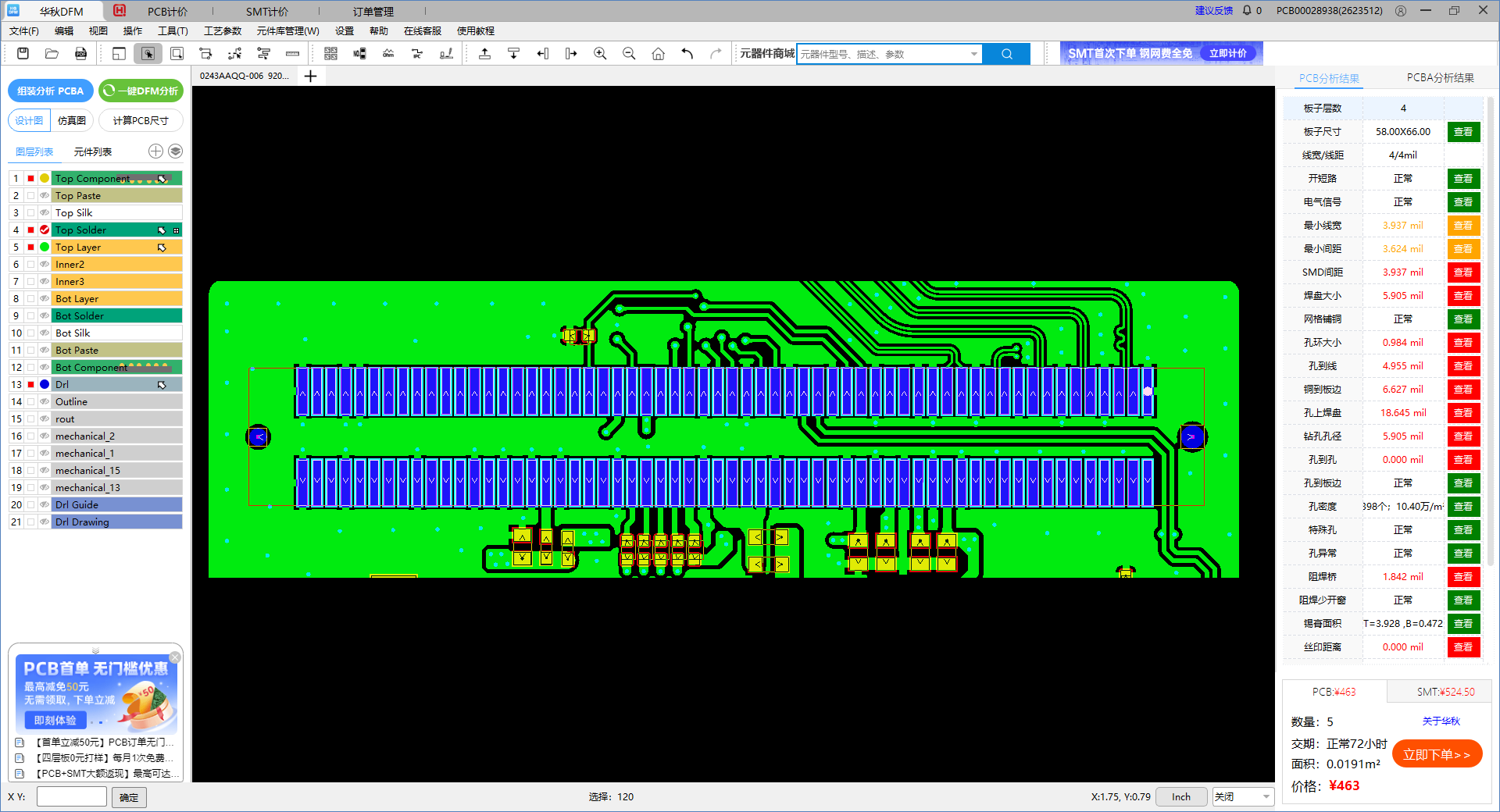 华秋DFM软件是国内首款免费PCB可制造性和装配分析软件,拥有600万+元件库,可轻松高效完成装配分析。其PCB裸板的分析功能,开发了29大项,100+细项检查规则,PCBA组装的分析功能,开发了14大项,800+细项检查规则。