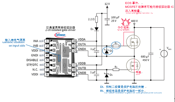 EOS 测试表明,栅极驱动器 IC 在 IC 输入端嵌入隔离栅后(如英飞凌科技股份有限公司的 EiceDRIVER™ 2EDR 系列),即使没有抑制二极管 D1,也能满足这两项要求。