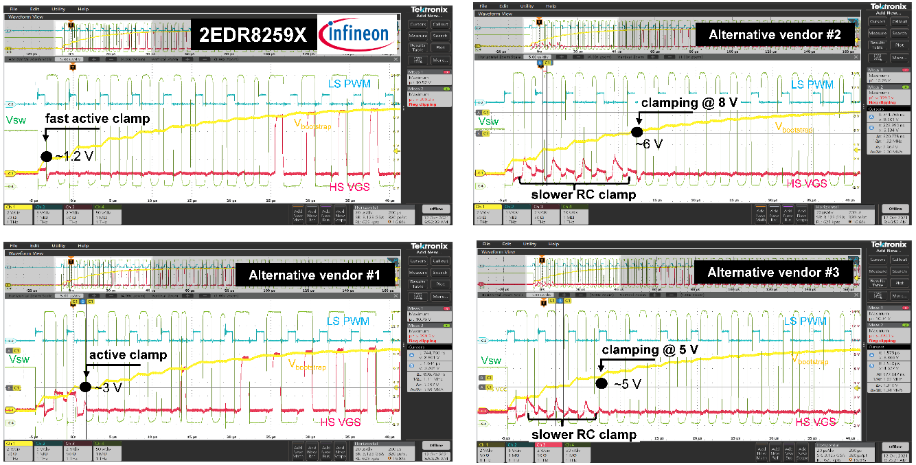 与此相反,如果栅极驱动器 IC 带有内置慢速RC 钳位电路,则在半桥的启动期间会出现一定程度的直通,直到最终 VDD 值高到足以激活输出钳位电路为止。这并非理想情况,因为这会导致开关器件的电气过载。